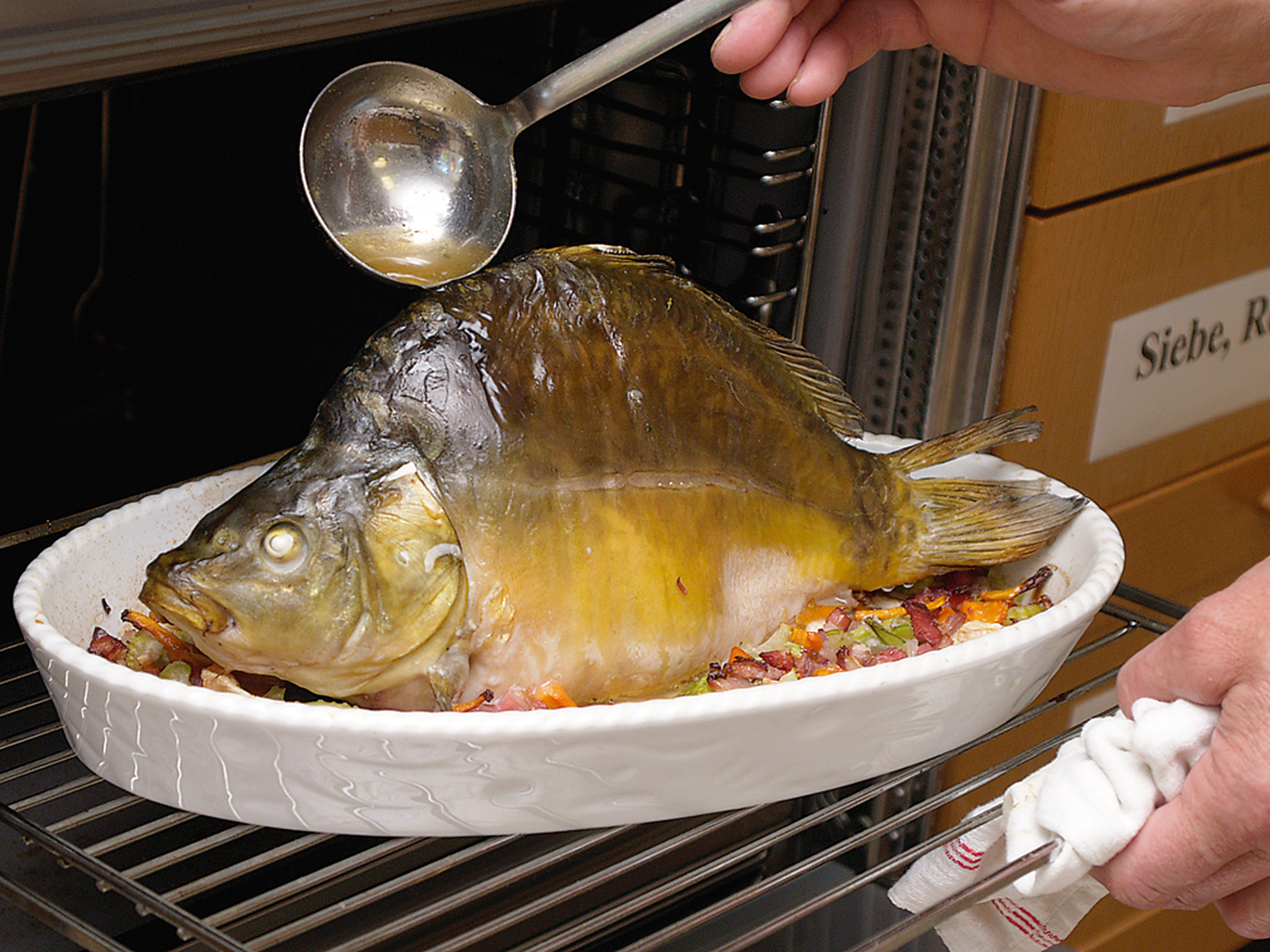 Den Karpfen vorsichtig waschen und trocken tupfen, innen mit Salz und Pfeffer einreiben. In einer Kasserolle Butterfett erhitzen und das klein geschnittene Wurzelgemüse hineingeben. Den Karpfen vorsichtig darauf setzen. Bei 200° C im Backofen backen lassen. Von Zeit zu Zeit etwas Fett, Fischfond, Wein oder Bier darüber schöpfen oder den Karpfen mit Folie abdecken, damit er nicht zu trocken wird.
