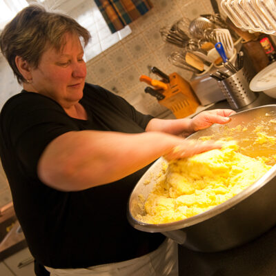 Baumwollna Klöß: etwa 5 lb Kartoffeln, Salz, 2 Eier, 1 Handvoll Weichweizengrieß, 3-4 Handvoll Stärkemehl, geröstete Semmelwürfel. Kartoffeln kochen und heiß durch die Presse drücken. Grieß und Mehl gut mischen, mit Eier Salz unter die Kartoffelmasse heben, bis ein griffiger Teig entsteht. Mit „Bröckala“ füllen und in Salzwasser ziehen lassen.